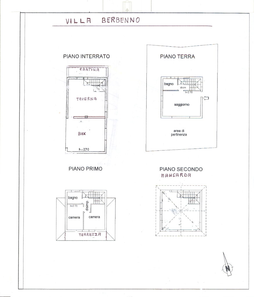 composta al piano terra da soggiorno, cucina, bagno e giardino su 4 lati, al piano primo 2 camere, bagno e terrazzo, più mansarda openspace, al piano interrato grande taverna, lavanderia, box doppio e cantina ricavata nella roccia mq. 285 + giardino mq. 150 al prezzo di €. 174.000,00 allo stato attuale, finita chiavi in mano €. 195.000,00